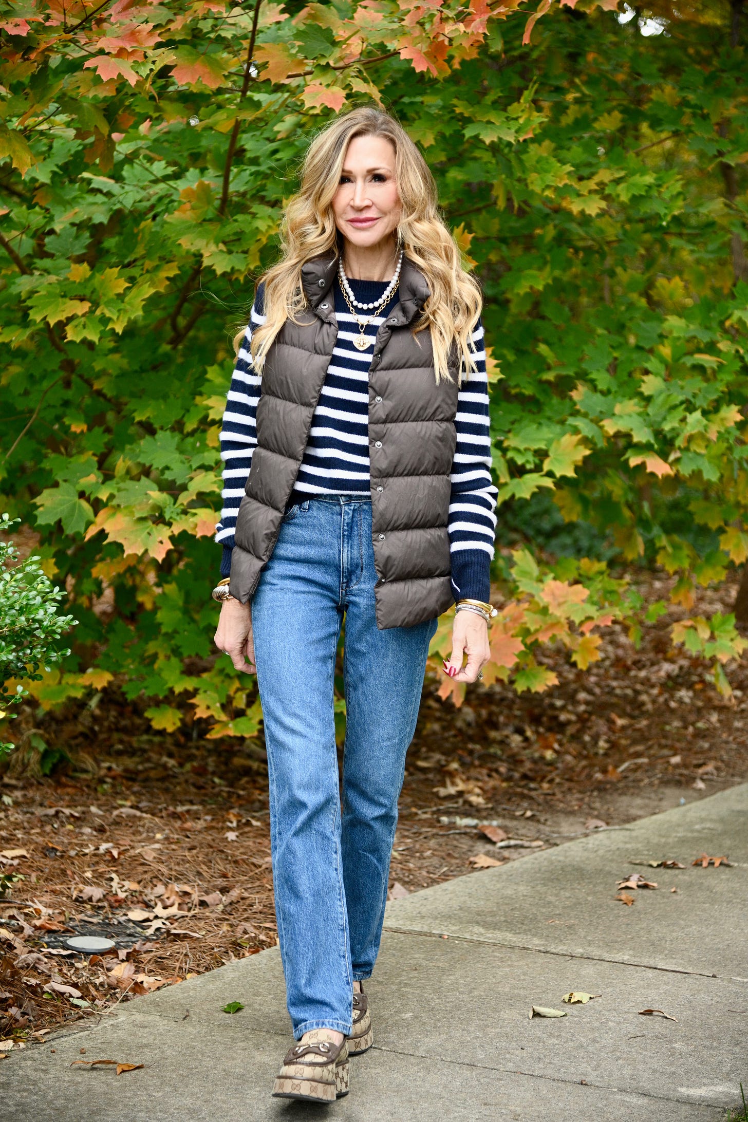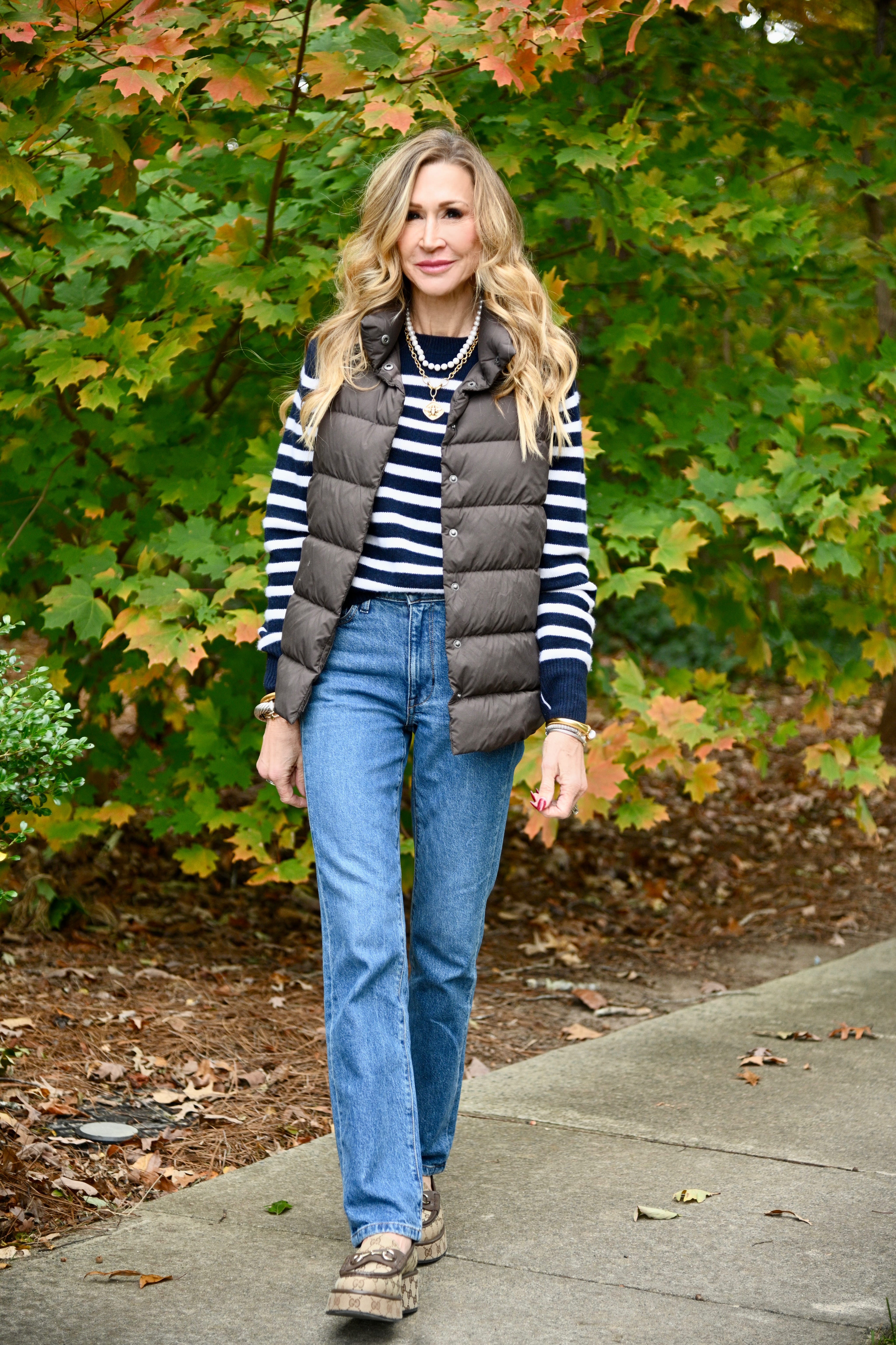 This outfit may be the exception to the “statement piece” realization…but we all need an everyday basic look to fall back on. It’s made up of closet essentials but I do think that the subtle pattern mixing going on in this look is interesting. I started with the jeans from AYR and a striped sweater (also love this one) which again…no brainer, but added the brown vest (similar here) and the Gucci loafers with brown to tie everything together. These loafers (sadly no longer available) have been some of my most worn because they seem to go with everything (these are a great option). I love the pattern of the shoes with the striped sweater.