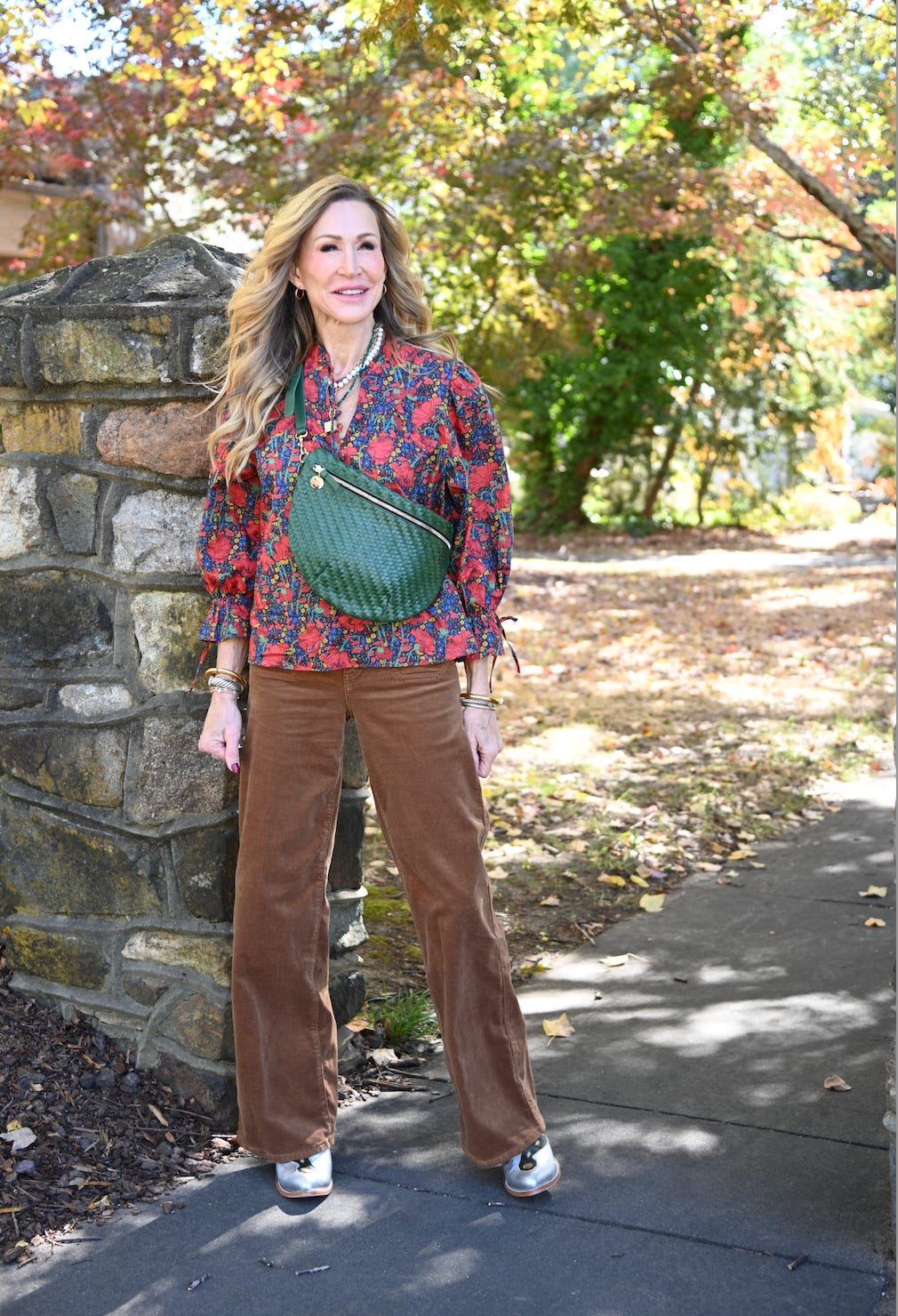I started with the brown corduroy pants from Frame (now 30% off) and layered in a fabulous top from Hunter Bell. The bag from Clare V (the Grande Fanny) picks up the green in the top perfectly, while the metallic Fraulein boots (the statement) echo the same shade which works perfectly. The green malachite necklace ties it all together. It’s a fun fall look that transitions through winter.
