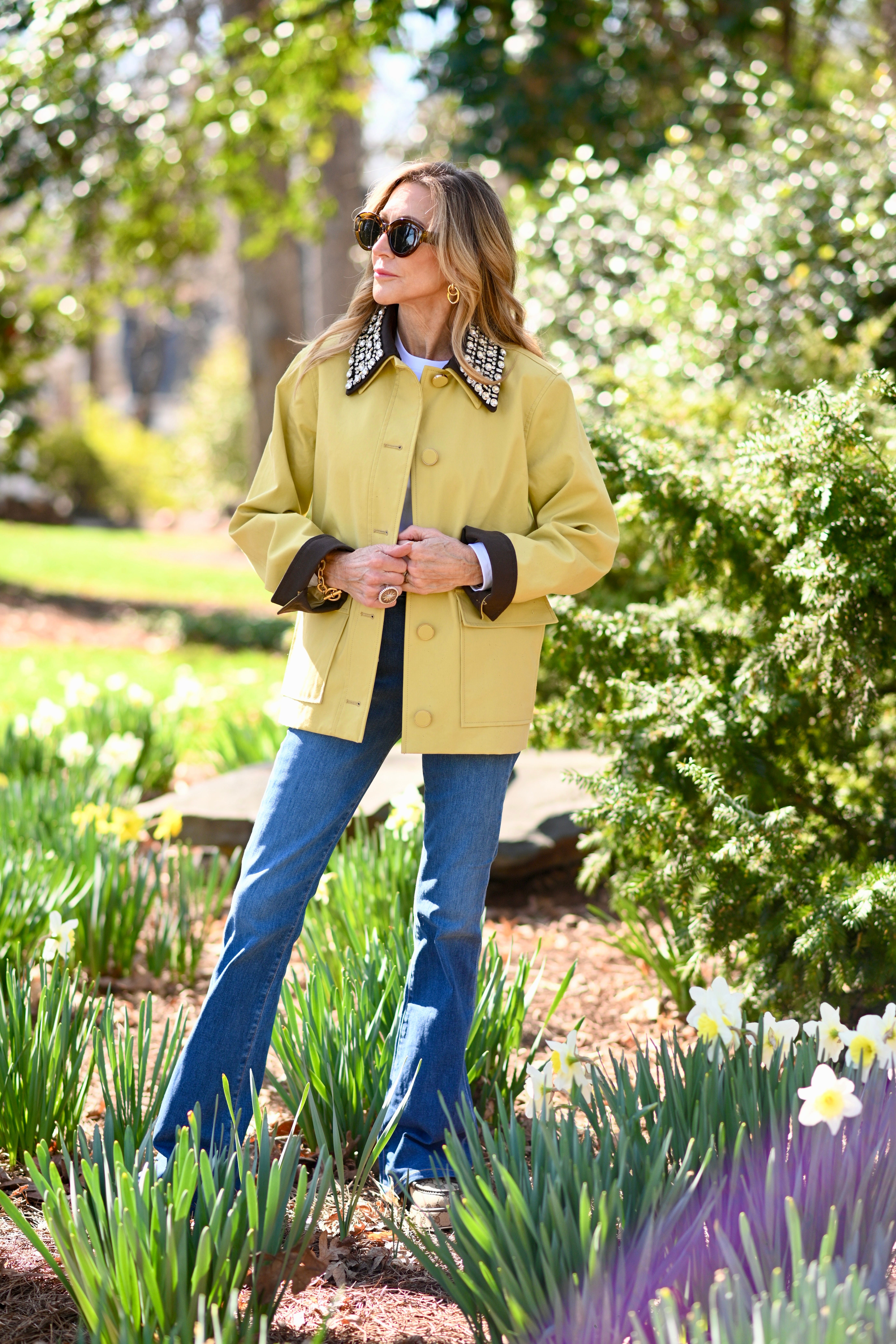 A statement jacket with a pair of jeans makes a great look in the spring. This jacket can be worn year round and has a detachable rhinestone embellished collar…the statement (similar here) and works with dresses and pants. I have it on with my Gucci platform loafers.