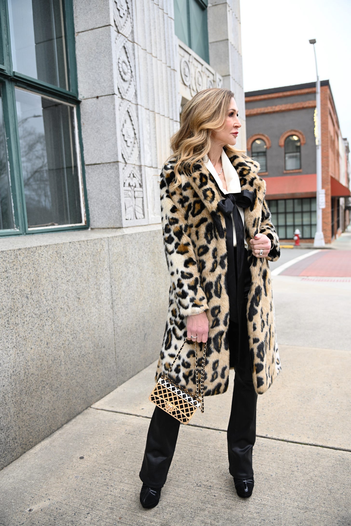 When is a leopard coat not a statement? This one from Mademoiselle Mink proves the point…its length adds warmth while instantly elevating a simple cream top with a black tie from and black coated pants from L’Agence. The gold bag is an older piece (I’ve linked a similar style here), and I’m wearing twenty-year-old Alexander Birman booties that I still reach for. I genuinely keep and wear my beautiful designer things…proof that investment pieces get better with time!