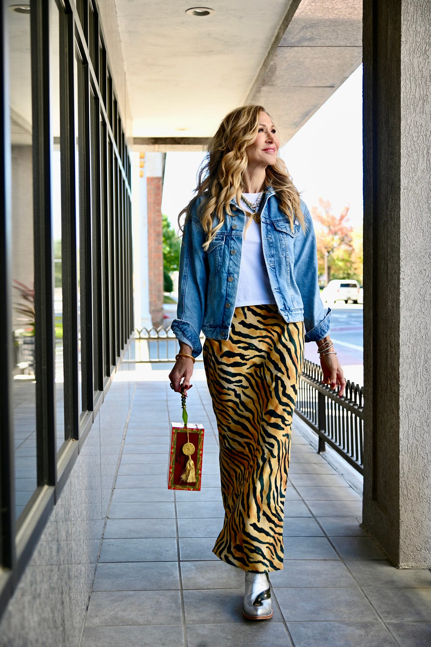 I kept things simple on the top with a short sleeve white tee and a cropped denim jacket letting the skirt and boots stand out. My necklaces are a strand of pearls layered with a green beaded malachite necklace from Hart which pulls the green from the boots upward. The vintage cigar bag somehow just works and compliments the skirt…not sure which makes a stronger statement. The gold tassel and red and green i handle (a slightly different of green, but close enough) add to the mix and feel right.