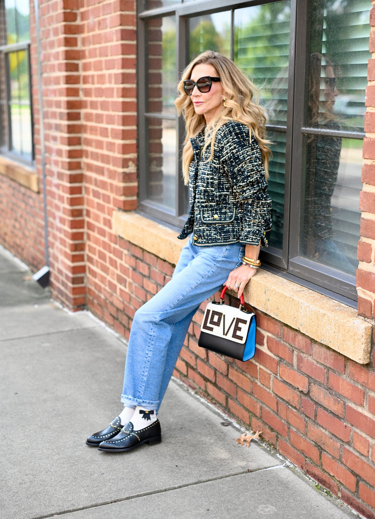 This look features the same black studded loafers worn earlier with the leopard pants, styled here with jeans and adorable Gucci socks (similar) for a playful twist. A classic tweed jacket from Spartina 449 (similar) keeps the look timeless, while the Love bag from Le Petit Joueur adds a big dose of personality and keeps everything feeling fresh and upbeat.