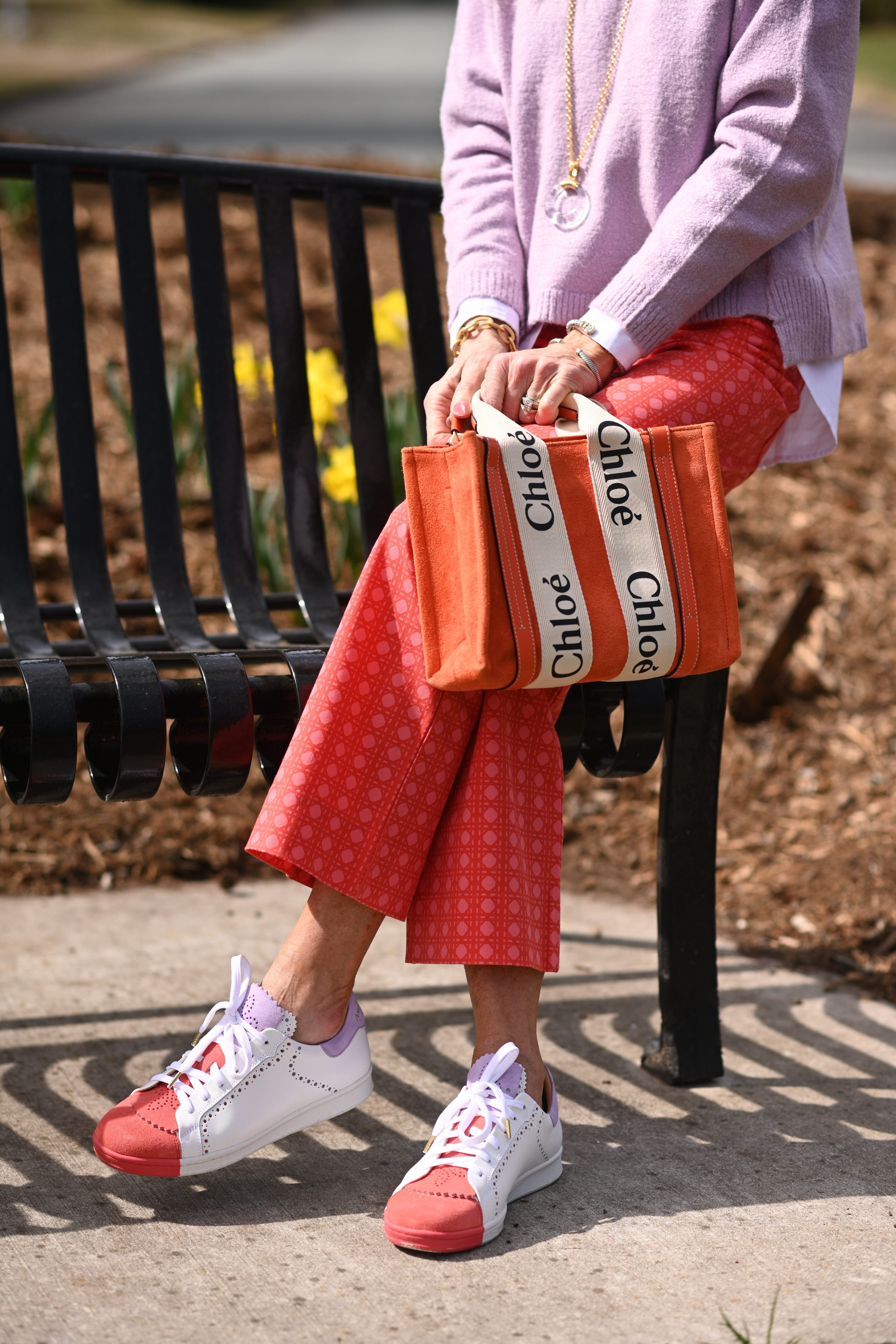 The sneakers from The Office of Angela Scott were the starting point for this look—once I decided on them, everything else followed. The lavender sweater (cardigan here) pulls the lavender from the shoe, while the Marin pant from Spartina 449 brings energy and personality to the look. The orange bag is the unexpected twist that makes the whole outfit feel intentional rather than safe. The necklace is from Julie Vos (love this one). Playing with color and texture is a great way to keep even the most basic pieces from feeling predictable. Clothes don’t have to be boring to be versatile—sometimes all it takes is one surprising choice to change the entire mood.