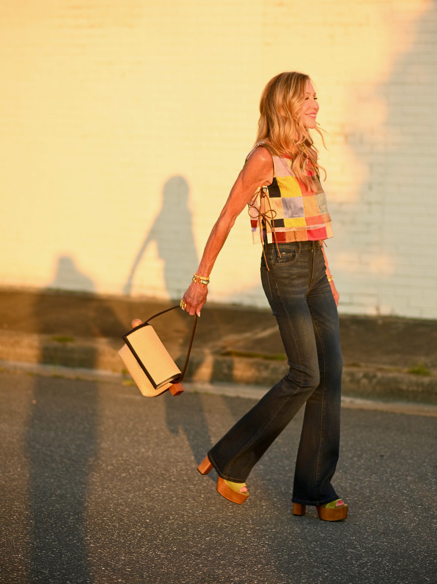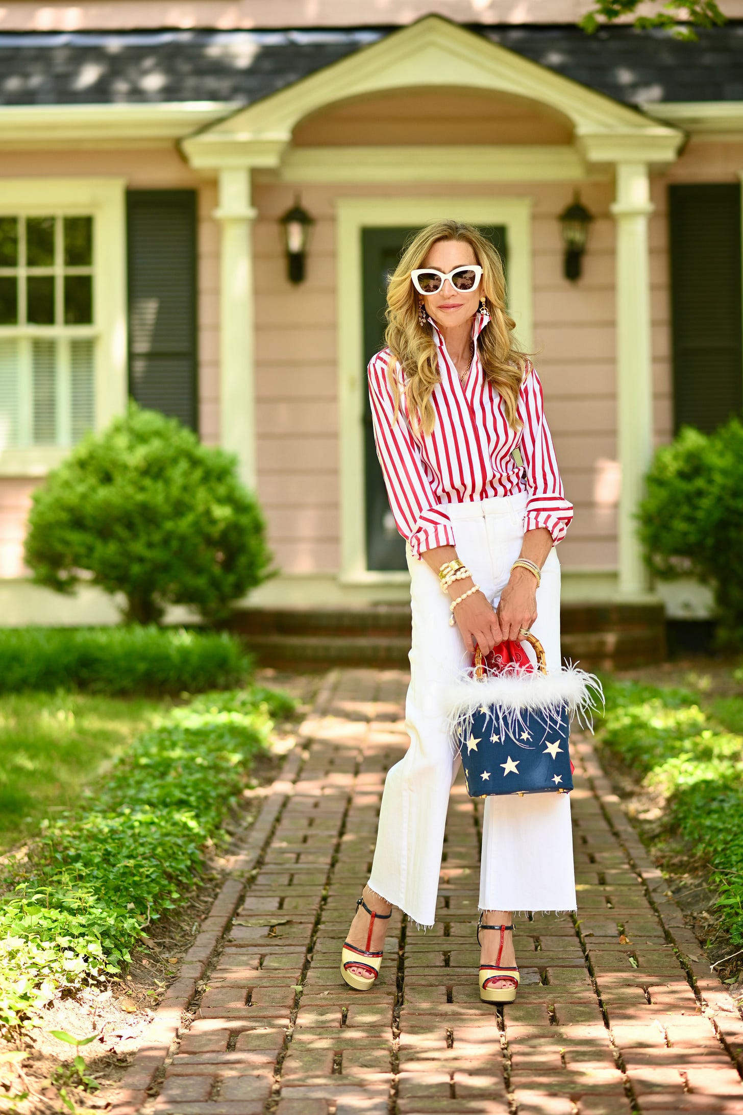 This fabulous bag from Coastal Clutch is the perfect finishing touch to a July 4th outfit. I have a collection of these fabulous bags and they always make the look! I’ve tied a red bandana around the handle of the bag to add a touch of red. The wide leg cropped flare jeans from Frank & Eileen are great styled with an older pair of cream, navy and red Gucci platform sandals (I also have quite a collection of these and will always keep them…the ones I’m wearing are probably 10 years old) and the crisp red and white striped blouse from Sarah Alexandra is a piece you’ll reach for often. Together, these pieces make an understated look for the 4th.