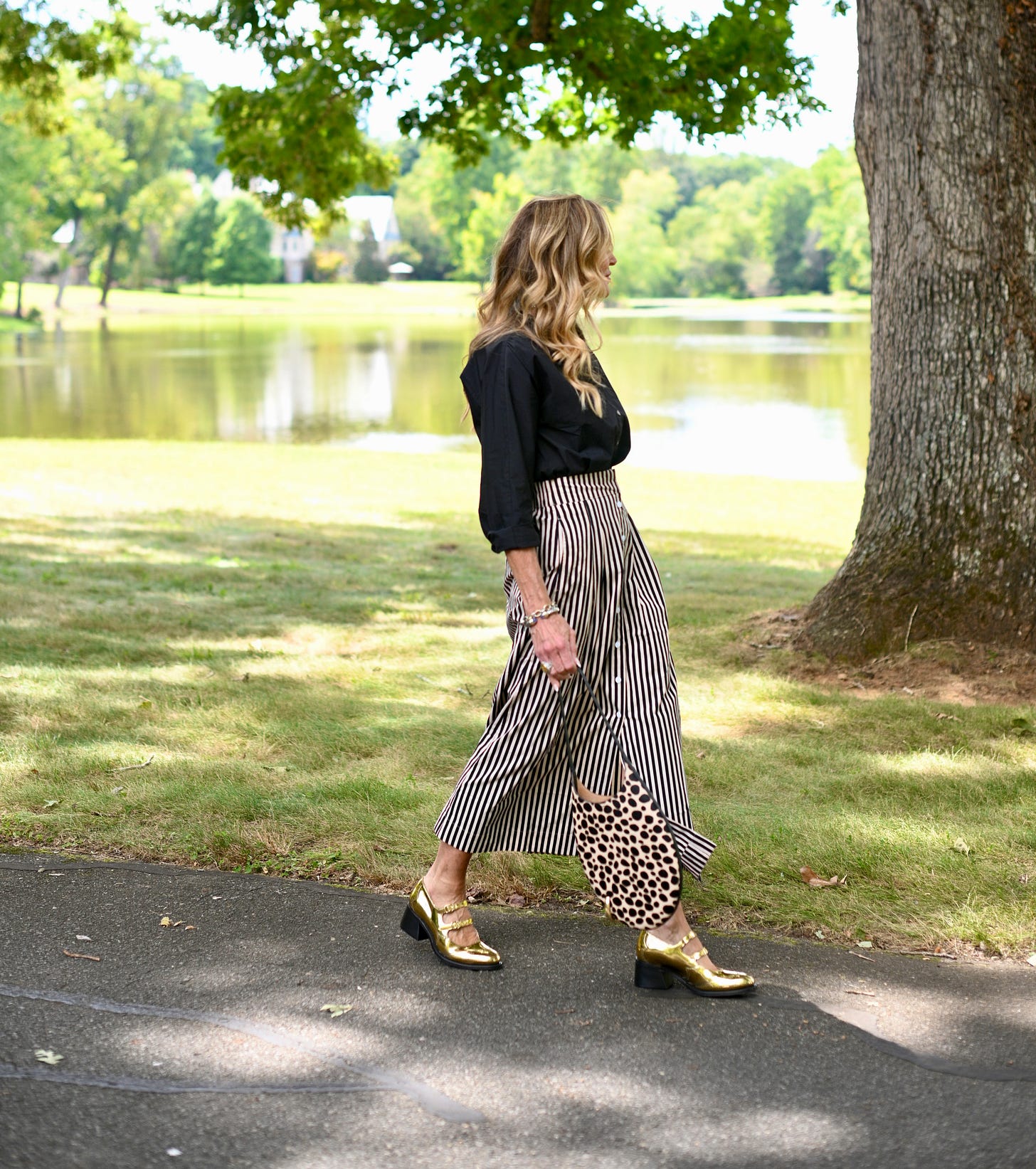 I call this my Julie Andrews look from Livero, but I actually love it. The striped skirt with the calf hair bag from Tory Burch feels unexpected but effortlessly chic and the “Miss Amelie” gold Mary Janes from The Office of Angela Scott are too fabulous for words (and now on major sale). A flawless fall ensemble that doesn’t stop at one season…come spring or summer, all it needs is a colorful bag to feel fresh.