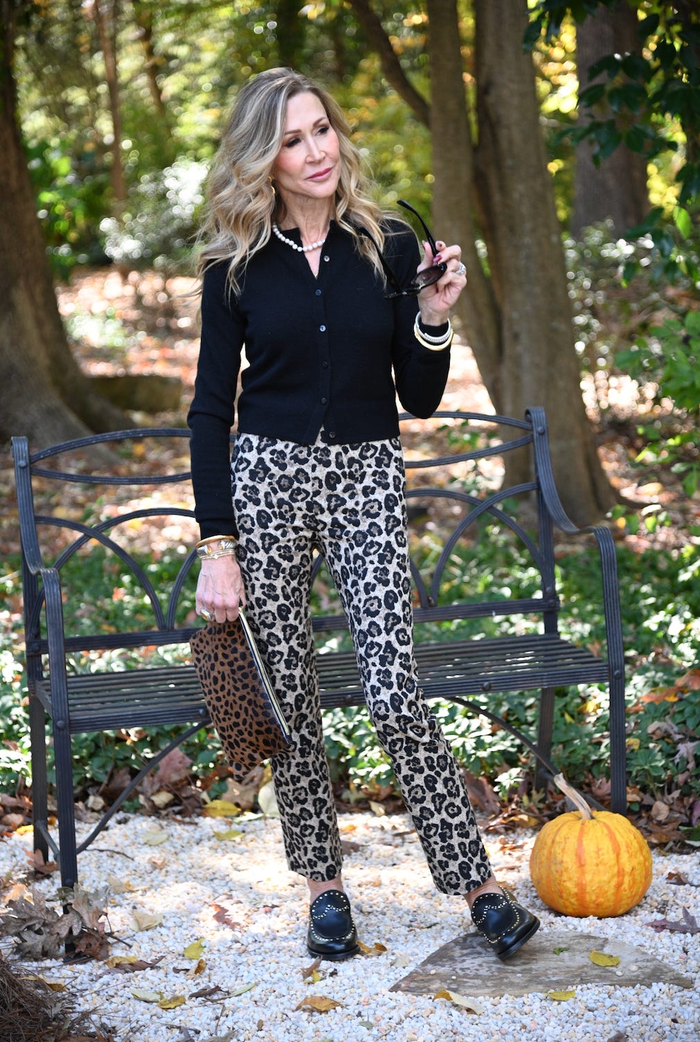 I love to mix leopard prints! These versatile leopard pants from Sezane (a most definite statement) seem to work with everything and are a perfect jumping off point for many outfits! I added a cropped black cardigan, a leopard clutch bag, fabulous studded black loafers from The Office of Angela Scott and black sunglasses and of course, pearls from Julie Miles because I find that pearls work with nearly everything!