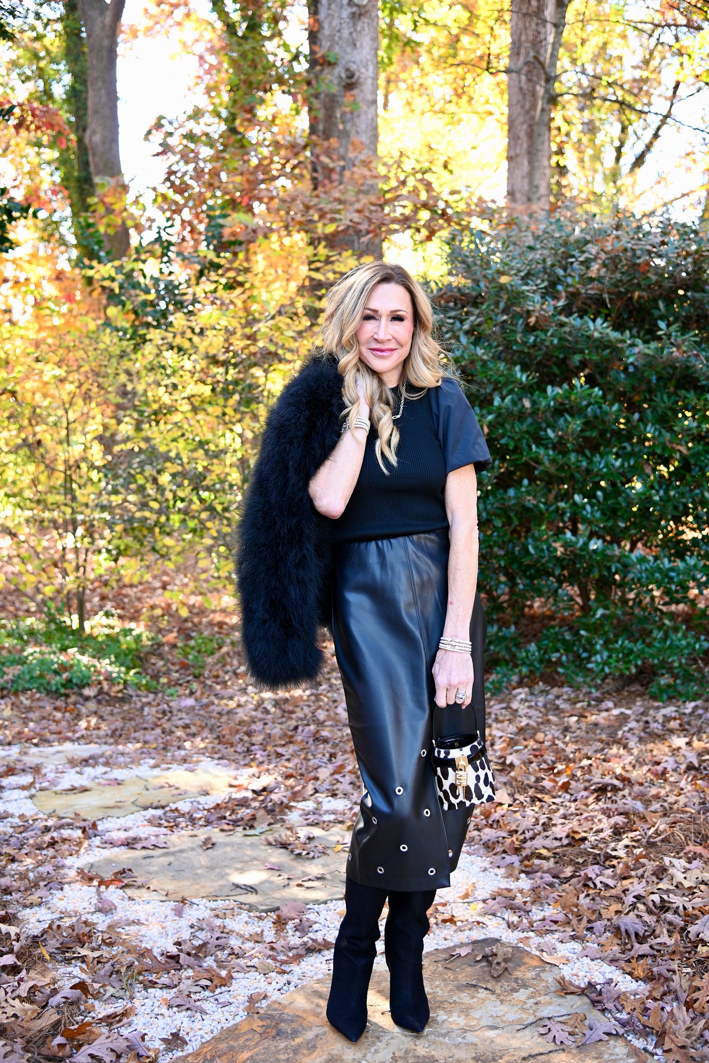 A tiny calf hair bag makes the perfect accent, while black suede boots ground the look. Finished with a fitted ribbed knit top featuring statement sleeves and topped with a faux fur jacket, this outfit strikes an ideal balance between edge and elegance.